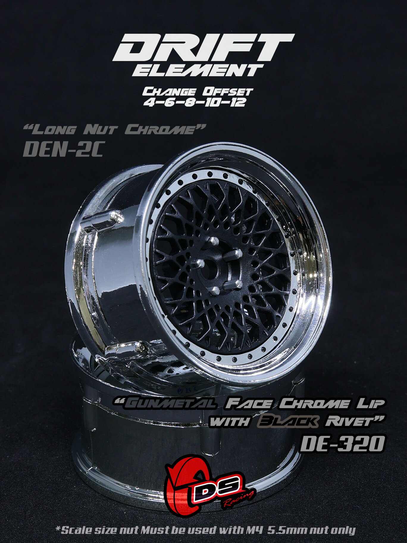 DRIFT ELEMENT SERIES RIM:Gunmetal Mesh Chrome Lip Black Rivets ドリフト エレメントシリーズ リム メッシュ ガンメタルスポーク クロームリップ ブラックリベット オフセット変更可能 1/10スケール 2個入り ドリフトラジコン パーツ
